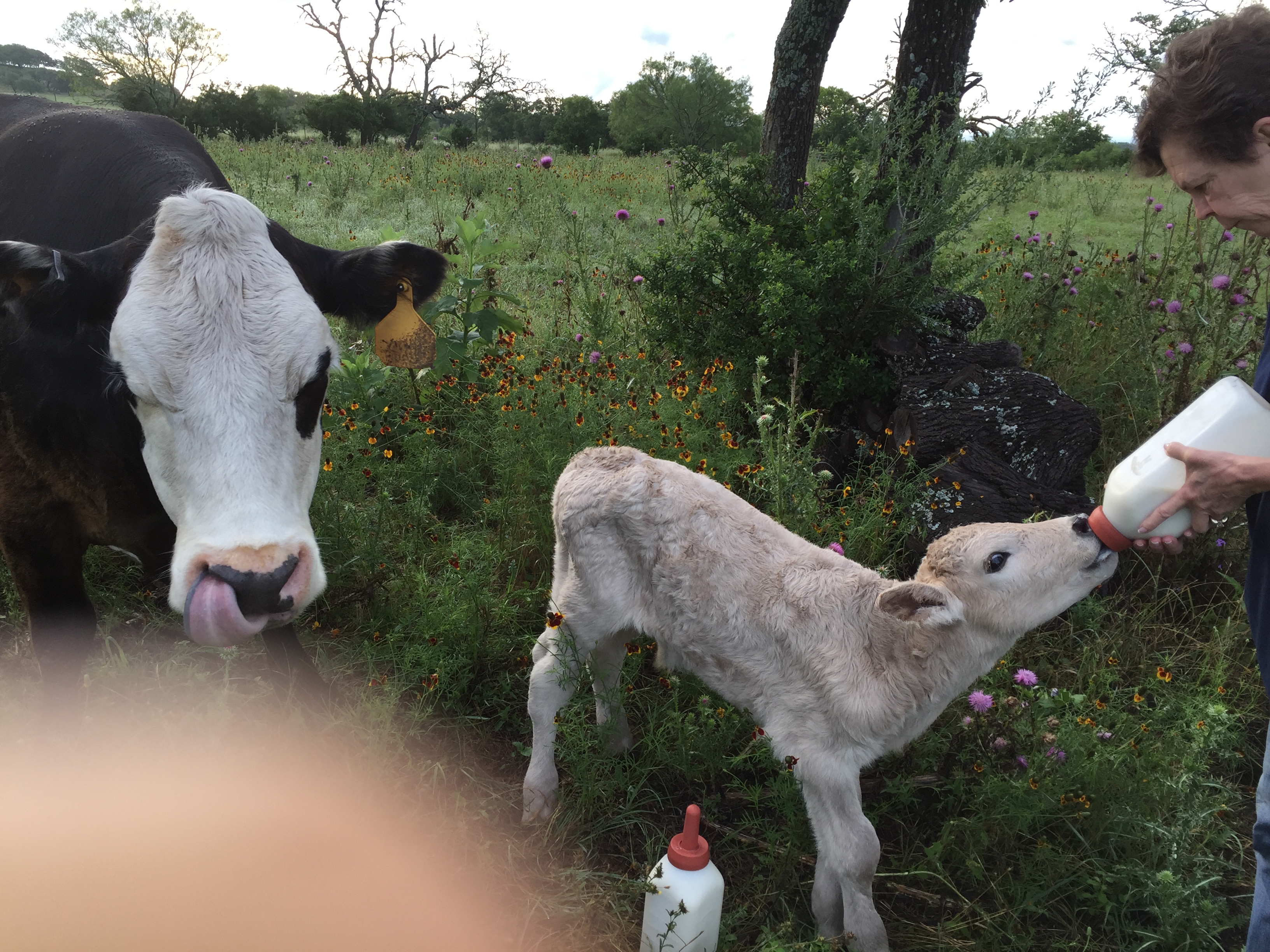Newest bottle calf being fed by Trudy with his good-for-nothing, calf-stomping mother looking on